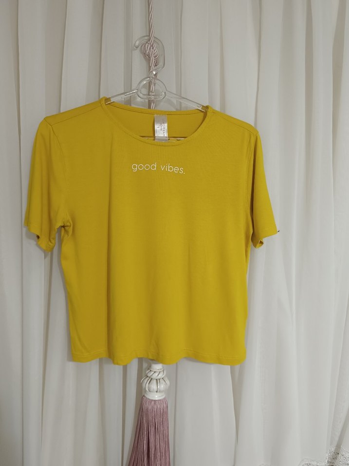 Sarı, kısa kollu pamuklu tişört, yuvarlak yaka ve minimalist "good vibes." baskılı. Rahat kesimiyle günlük sokak stiline uygun.