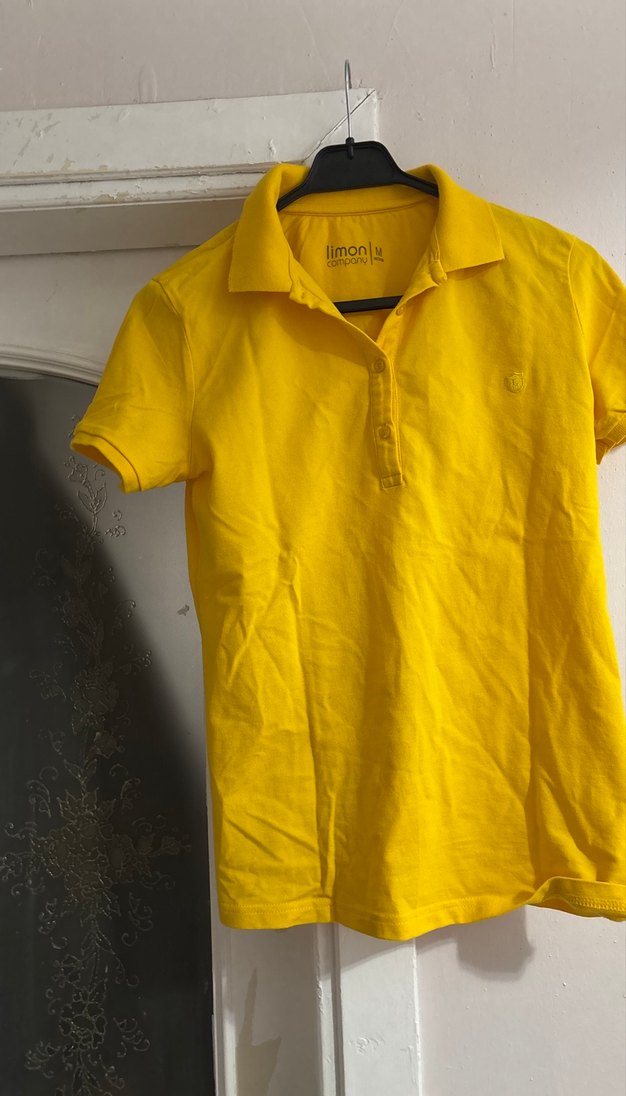 Pamuk kumaştan üretilmiş, sarı renkli, kısa kollu, yakalı ve düğmeli, parlak görünümlü, sade desenli, fitted kesim polo tişört.