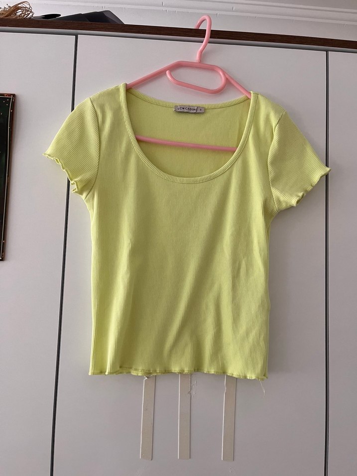 pastel sarı renkte, kısa kollu ve yuvarlak yakalı, yumuşak sentetik kumaştan yapılmış dar kesim tişört. Trend sokak stili için uygundur.