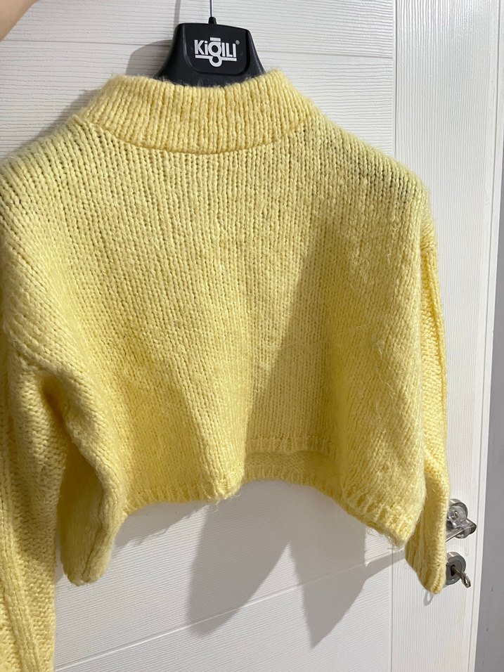 Sarı renkli, örgü kumaştan kısa ve bol kesim kadın kazak. Yuvarlak yaka ve uzun kollu, rahat ve günlük kullanıma uygun.