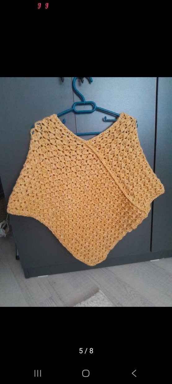 Açık sarı renkli, örgü panço. Salaş kesim ve yuvarlak yaka, kısa boy. Günlük kullanıma uygun, rahat ve bohem tarzda. tamamı el örgüsü 5 yaş itibari ile 7 yaşına kadar uyumludur çocuğun kalıbına göre değişiklik gösterir ölçüleri iki omuz arası 37 cm ile 40 cm aralığı idir baş kısmından geçtikten sonraki yaka kismi ve aşağı inen üçgen kismin uzunluğu 45 cm ile 50 cm aralığı idir bu ölçülere göre olcu alarak beden hesaplaması yapabilirsiniz