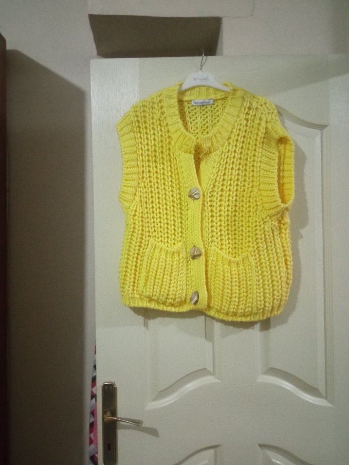 Ön düğmeli, yuvarlak yakalı, salaş kesim sarı kısa triko süveter, günlük kullanıma uygun.