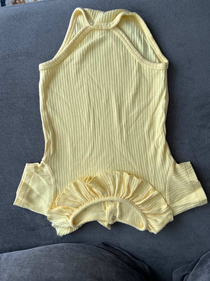 Sarı pastel renkte, kolsuz kız bebek body. Yumuşak, fitilli kumaştan, boğazlı yakalı ve alt kısmında fırfırlı detaylı.