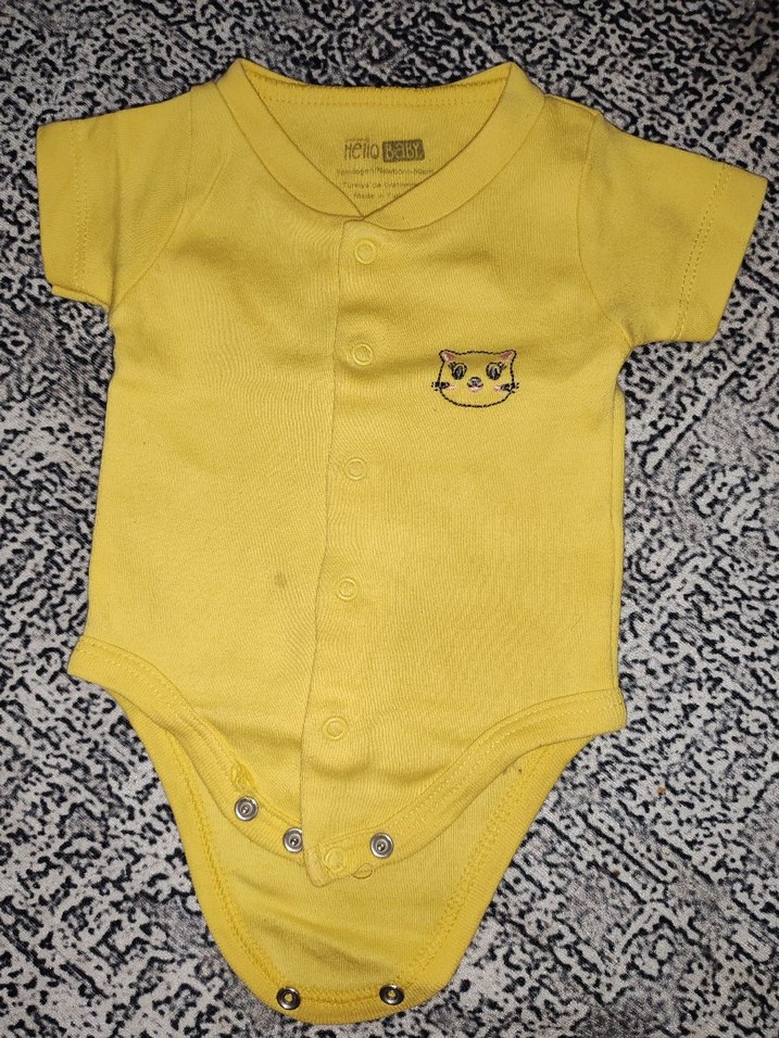 Sarı renkli, kısa kollu, yuvarlak yakalı ve çıtçıtlı kız bebek body. Göğüste küçük kedi nakışı bulunur.