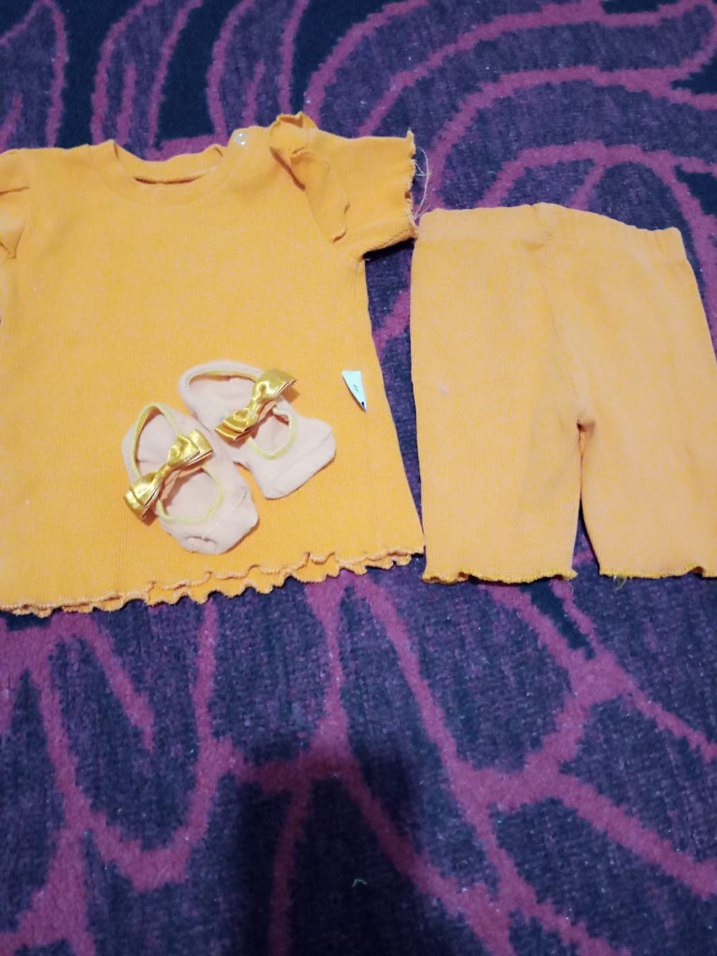 Pastel sarı kısa kollu üst ve şorttan oluşan kız bebek takımı, rahat ve sade şıklık sunar.