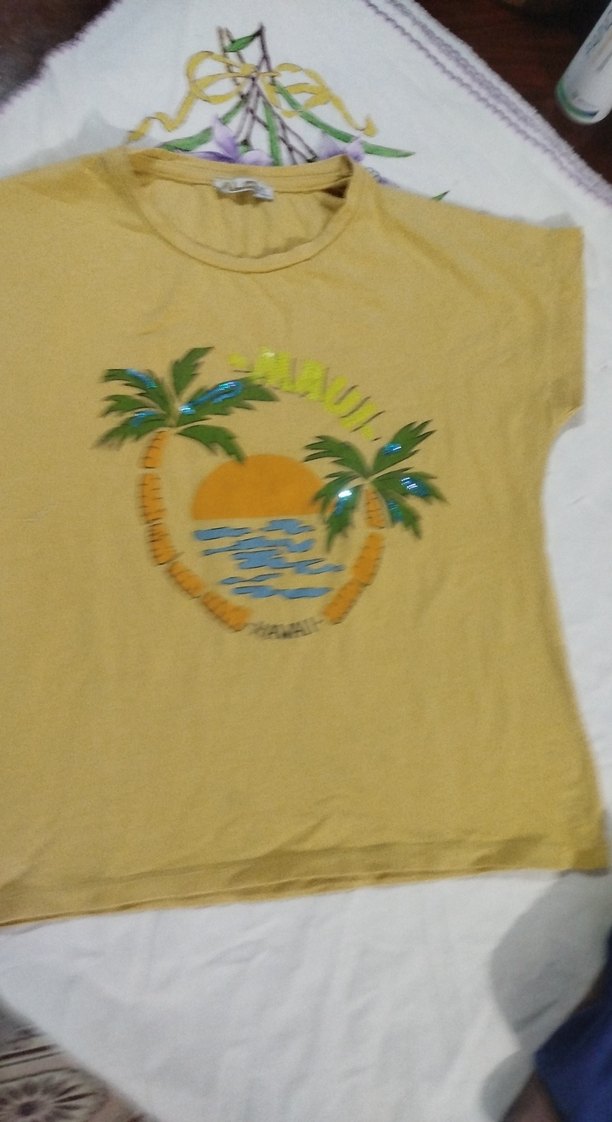 Sarı renk, yuvarlak yaka ve kısa kollu,likralı bol kesim kız çocuk tişörtü. Tropikal baskılı, pastel tonlarda rahat bir modeldir.