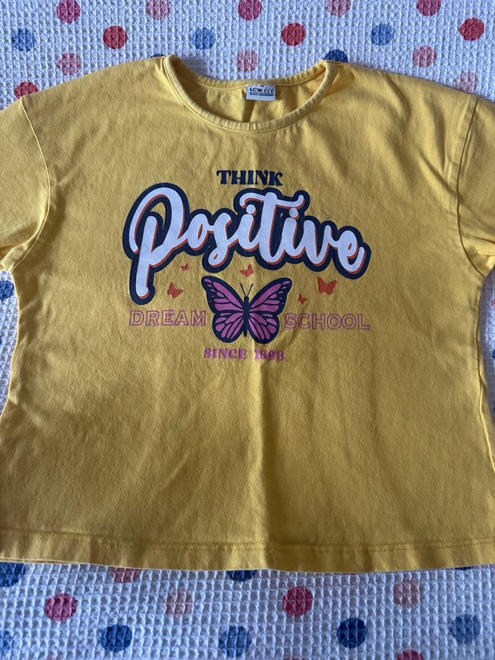 Sarı, kısa kollu, yuvarlak yaka, bol kesim kız çocuk tişörtü. Üzerinde pozitif mesaj ve kelebek baskısı bulunur. Bohem ve retro tarzına uygun.