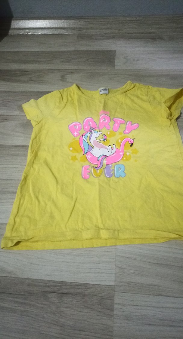 Sarı renkli, pamuklu, kısa kollu, yuvarlak yakalı, bol kesim tişört. Üzerinde renkli bir unicorn ve 'PARTY EVER' yazısı baskılıdır.