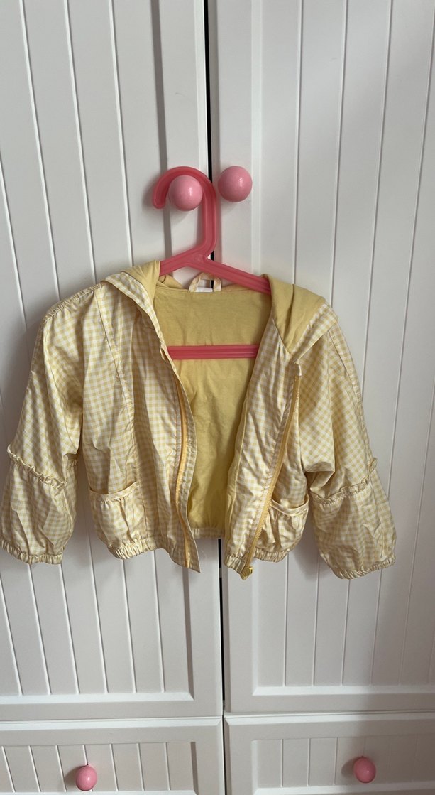 Düğmeli, sarı kız çocuk yağmurluğu, bol kesim ve yakası çıtçıtlıdır. Sentetik kumaştan yapılmış, pastel tonlarda ve desensizdir. ️