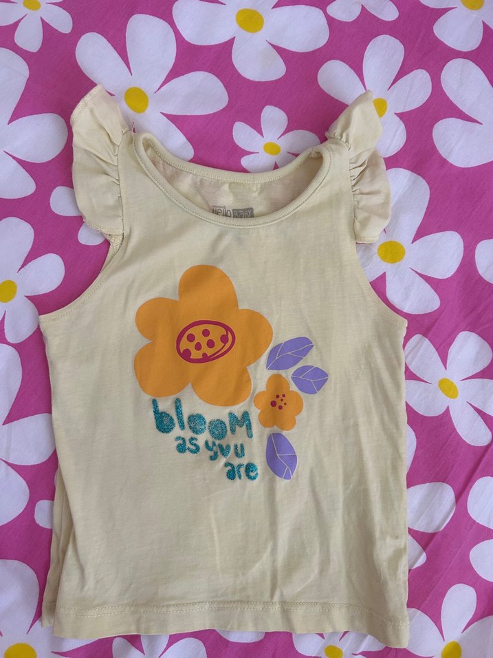 Sarı pamuklu askısız tişört, fırfırlı kısa kollu ve bol kesim. Çiçek baskısı ve 'bloom as you are' yazısı bulunur.