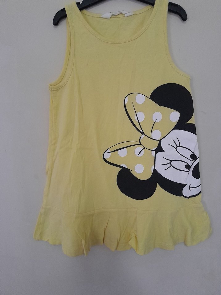 Sarı renkli, fırfırlı detaylı, baskılı ve askılı kız çocuk atlet, yumuşak sentetik kumaştan, rahat kesim.
