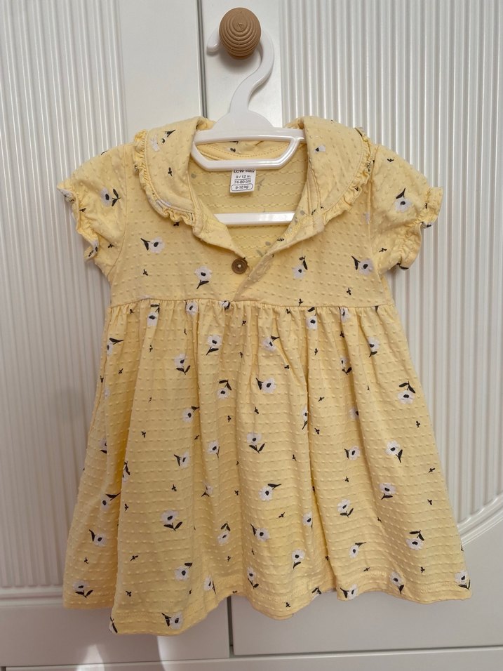 Sarı renkli, pamuk kumaştan, kısa kollu, fırfırlı yakalı ve baskılı desenli, bol kesim kız çocuk elbisesi.