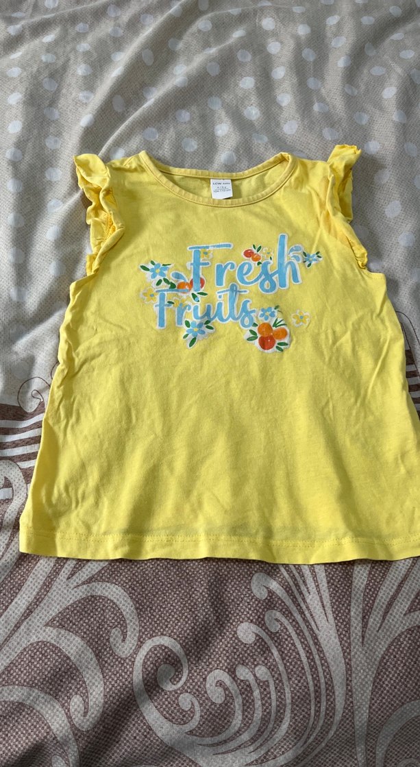 Sarı, fırfırlı kol detaylı, pamuklu, bol kesim kız çocuk tişörtü. Önünde renkli "Fresh Fruits" baskısı bulunur.