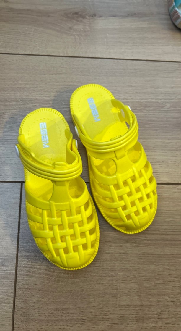 Sarı renkli kauçuk kız çocuk sandaletleri, kare desenli ve tokalı kayışlı, hiç kullanılmadı