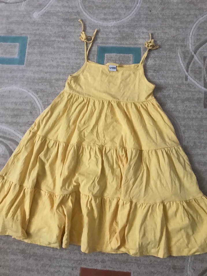 Sarı keten kumaştan, askılı ve fırfırlı detaylı, salaş kesim kız çocuk elbisesi. Straplez yakasıyla bohem tarzı yansıtıyor.