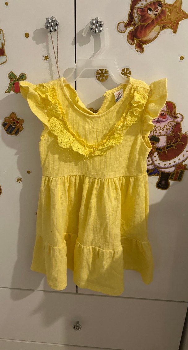 Keten kumaştan, fırfırlı ve nakışlı detaylara sahip, V yaka ve bol kesimli sarı kız çocuk elbisesi.