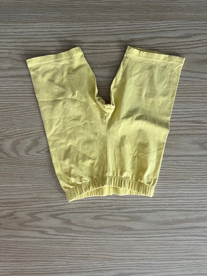 Yumuşak keten kumaştan yapılmış, pastel sarı renkte, kız çocukları için dar kesim tayt.