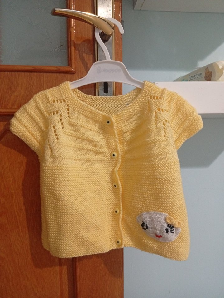 Sarı renkli, kısa kollu, bol kesim kız çocuk örgü hırka. Düz tasarım ve sevimli yüz detayı bulunur. Yumuşak örgü kumaştan üretilmiştir.