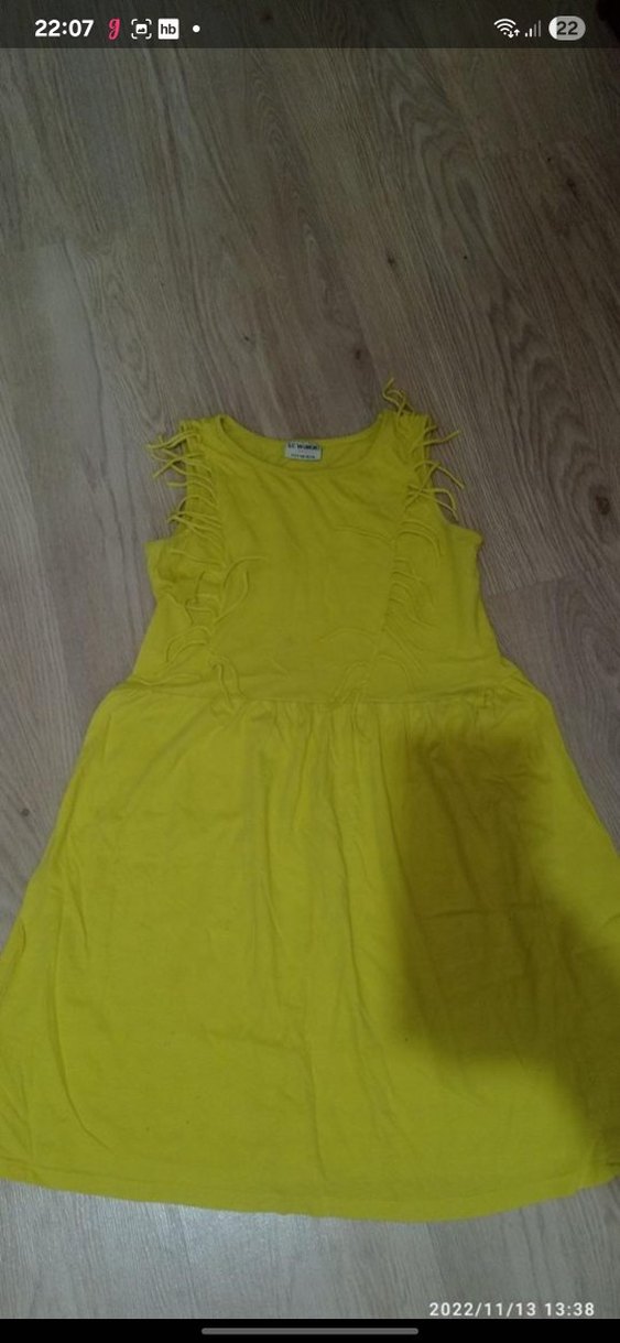 Sarı renkli, kolsuz ve fırfırlı detaylara sahip elbise. Yuvarlak yakalı, yumuşak sentetik kumaştan, bol kesimli bohem tarzda.