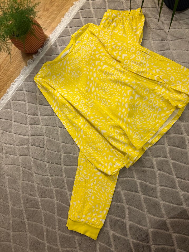 Uzun kollu, salaş kesim ve kayık yaka tasarımlı sarı pijama takımı.