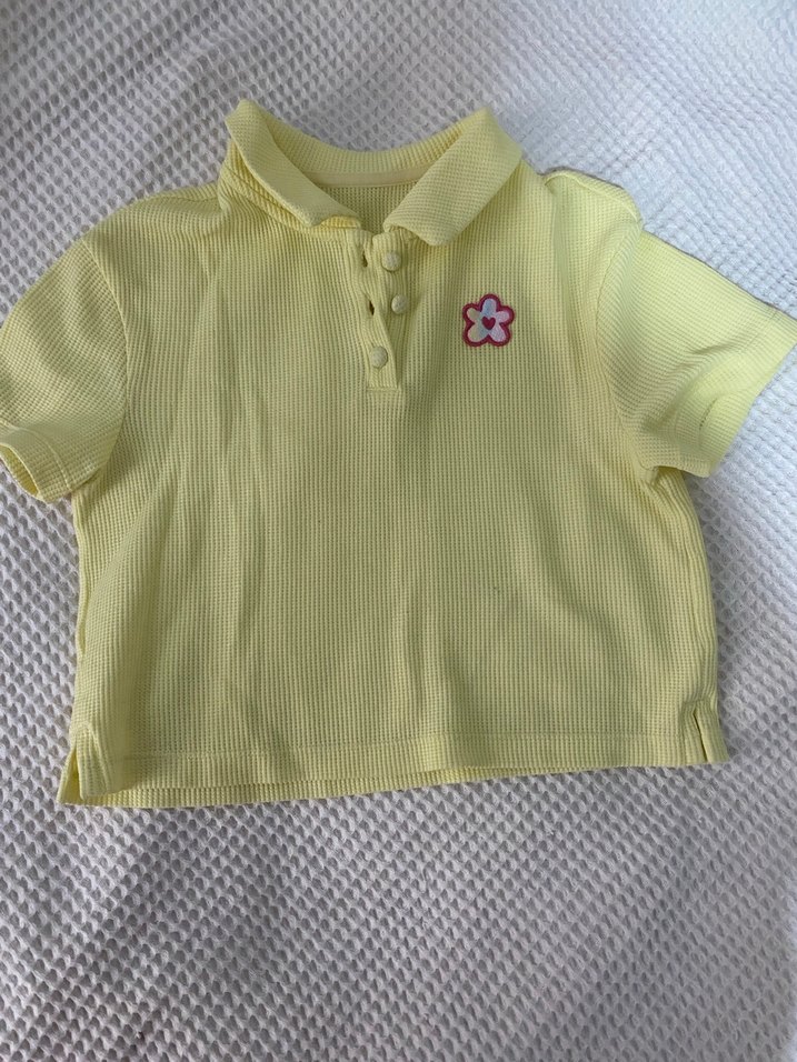Sarı renkli, kısa kollu ve düğmeli yakaya sahip pamuklu kız çocuk polo tişört. Pastel tonlarda, baskılı küçük çiçek detayıyla şık ve rahat bir model.