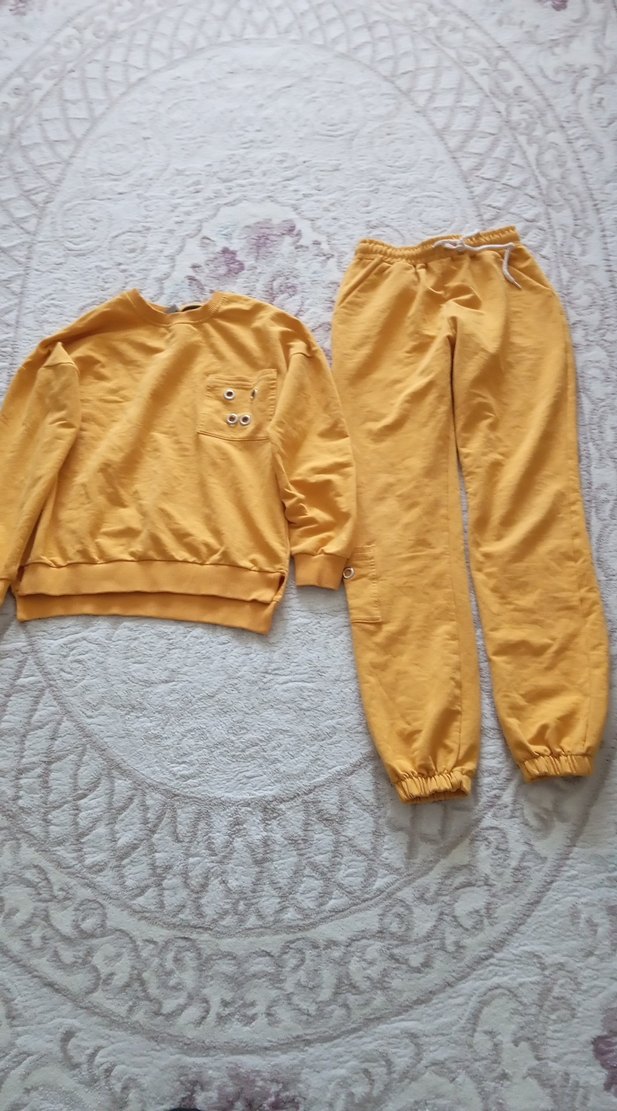 Sarı renkli, uzun kollu, yuvarlak yakalı ve salaş kesim kız çocuk sweatshirt ve eşofman takımı. Rahat ve şık, cepli detaylı.