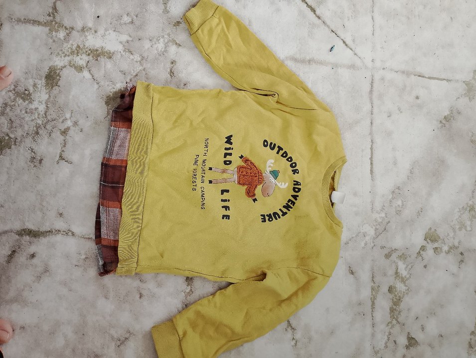 Uzun kollu, yuvarlak yakalı sarı kız çocuk sweatshirtü. Yumuşak ve sıcak kumaştan, bol kesim. Baskılı outdoor macera teması ve örme manşetler ile retro tarz.