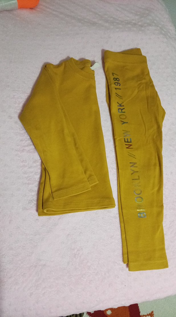 Dar kesim sarı sweatshirt ve eşofman takımı, yuvarlak yaka ve baskılı desenle, yumuşak ve sıcak kumaştan üretilmiştir.