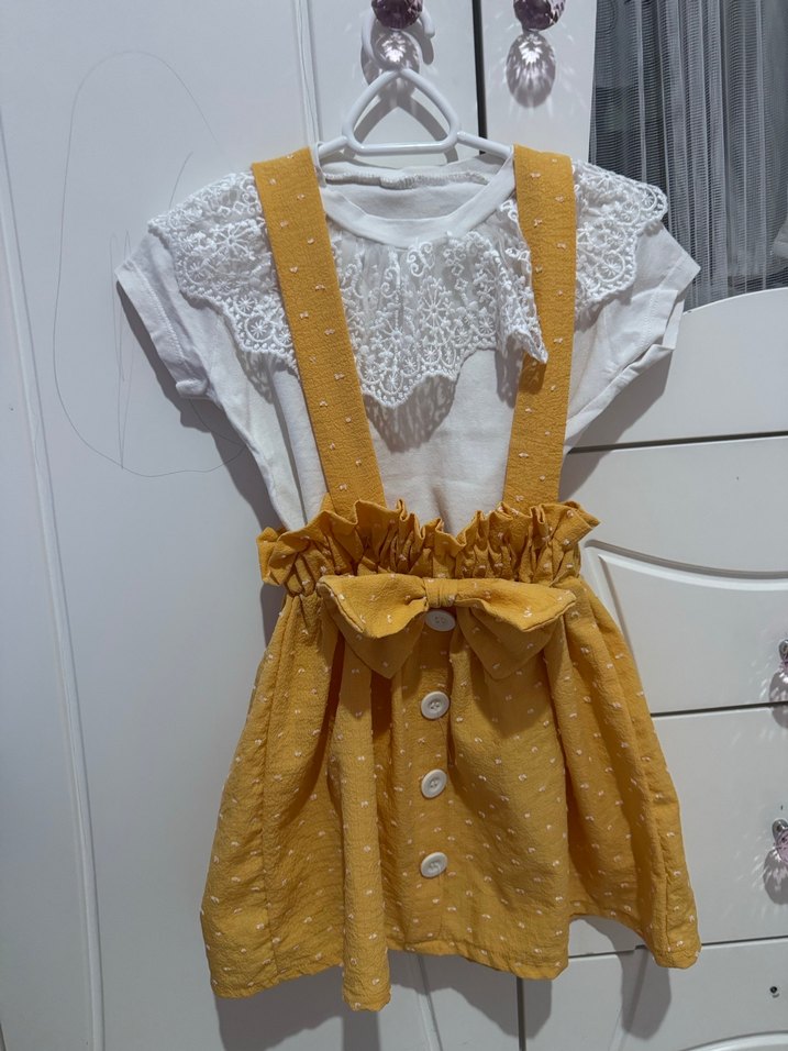 Sarı renkli, , askılı kollu, kız çocuk elbisesi, düğmeli ön detaylı ve bohem tarzda
