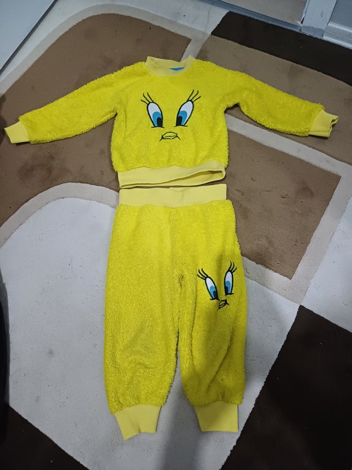 Sarı renkli, triko dokulu, uzun kollu ve bisiklet yaka kız çocuk eşofman takımı. Renkli ve desen içermeyen, rahat kesimli, üzeri sevimli yüz baskılıdır.