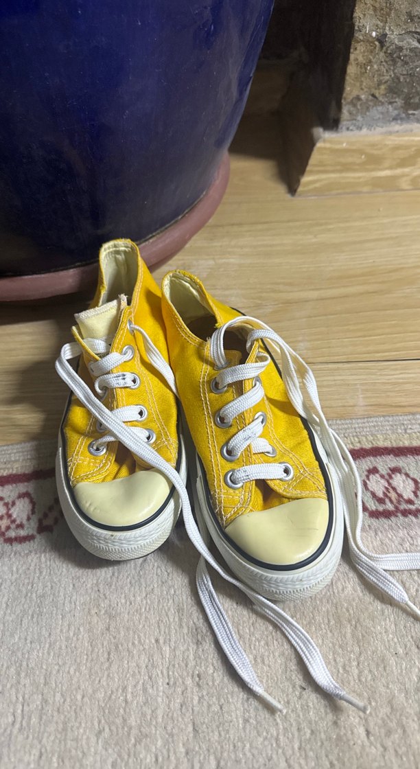 Sarı renkli, lastikli ve desen içermeyen spor ayakkabısı, rahat kauçuk tabanlıdır.