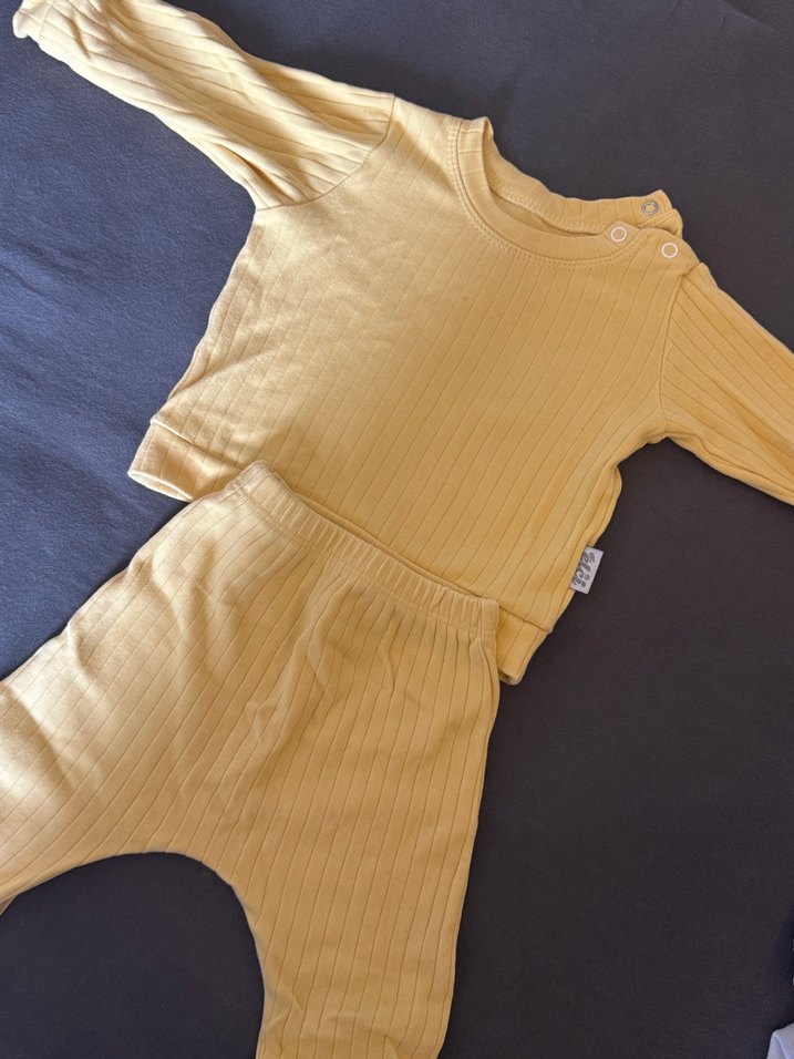 Yumuşak pastel sarı renkli, çıtçıtlı uzun kollu üst ve eşleşen fitilli pantolonlu bebek kız takım. Sokuk yırtık yok