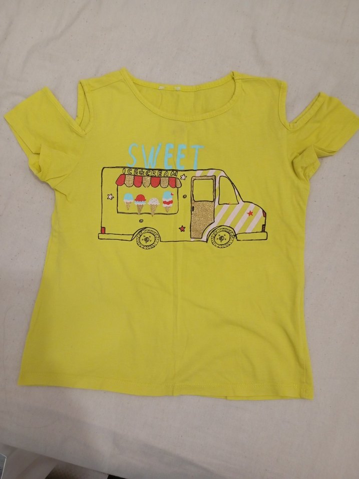 7 yaş, Sarı renkli, önünde renkli dondurma kamyonu ve "SWEET" yazısı bulunan kız tişörtü. Kısa kollu, yuvarlak yakalı, yumuşak sentetik kumaş.