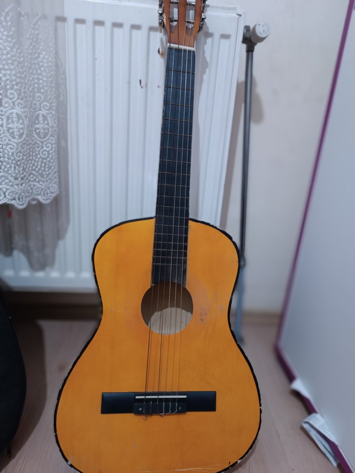 Altı telli, ahşap gövdeli ve pürüzsüz klavyesi olan açık sarı klasik gitar. bazı yerlerinde defo ve eskime vardır tellerinim yeri değiştirilmiştir teller yenilenmelidir