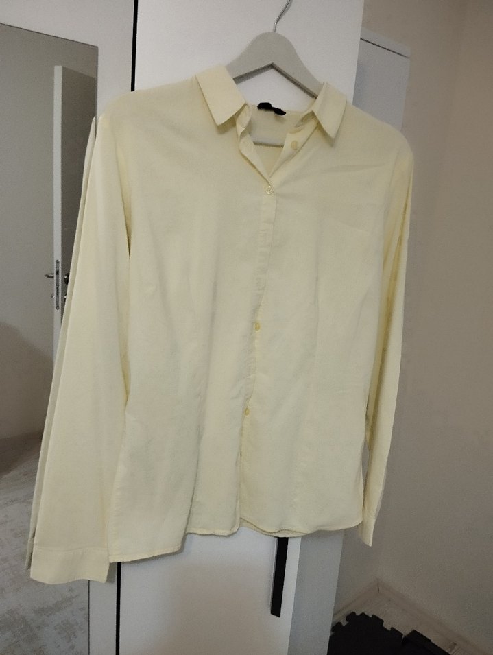 Sarı uzun kollu, klasik yakalı keten gömlek, düğmeli ve regular fit. Minimalist, desensiz tasarımıyla ofis kullanımı için uygundur.