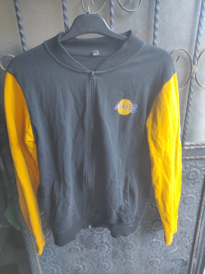 Sarı uzun kollu ve siyah gövdeli, fermuarlı, baskılı desenli bol kesim erkek sweatshirt. Yumuşak ve sıcak kumaştan, sportif şıklık için uygundur.