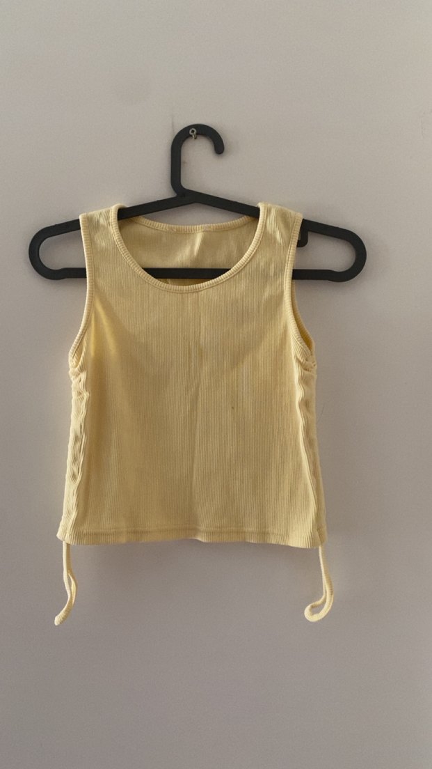 Yumuşak keten kumaştan sarı kolsuz basic atlet, vücuda oturan kesimi ve sade tasarımıyla günlük kullanıma uygundur. (Yanları iplikli bağlamalı)