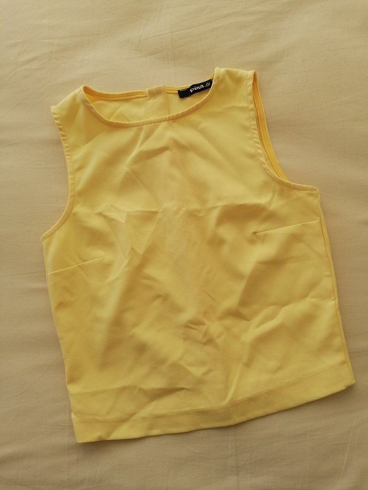 Sarı renkte, kolsuz, yuvarlak yakalı ve bol kesim kadın atlet. Düz ve pastel tonu ile günlük kullanıma uygun, minimal ve rahat bir tasarım. Arkası düğmeli
