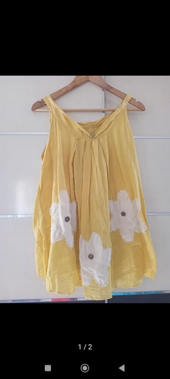 Sarı renkli, kolsuz, keten kumaştan bohem tarzda Askılı, hafif batik desenli, beyaz çiçek detaylarıyla süslenmiş.