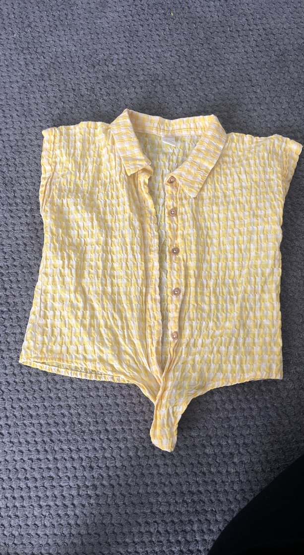 düğmeli ön ve yakalı, kolsuz sarı gömlek