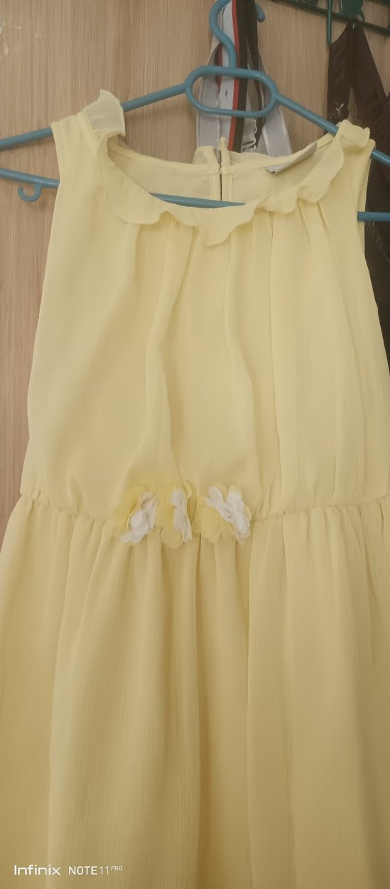 Yumuşak sentetik kumaştan yapılmış, kolsuz ve fırfır detaylı sarı elbise. Straplez yaka ve bol kesimiyle klasik bir görünüm sunar.