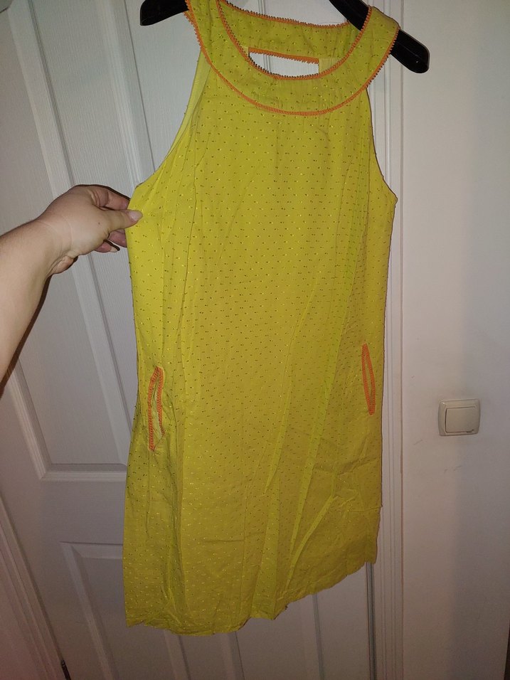 Kolsuz, sarı hamile midi elbise. Keten kumaştan, fermuarlı cepler ve parlak dokunuşlarla günlük kullanıma uygun.