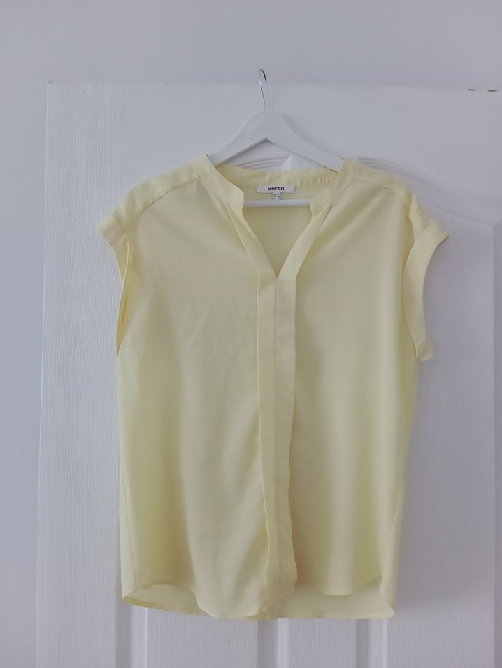 Sarı, kolsuz, rahat kesimli bu bluz, ipeksi dokusuyla minimalist ve normcore tarzda, ofis kullanımı için uygundur.