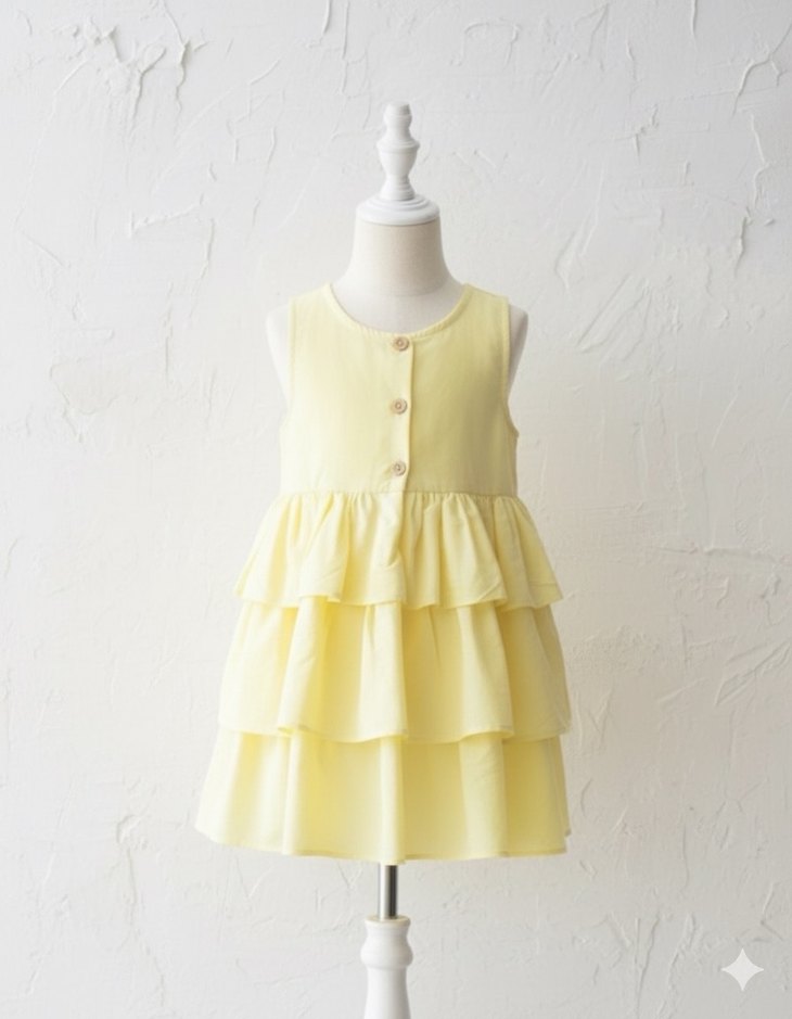 Kolsuz, bol kesim ve katlı fırfırlı sarı elbise, yumuşak dokulu saten kumaştan. Önü düğmeli yuvarlak yaka. Bedeni 3-4 yaştır.
