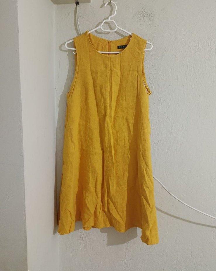 Nefes alabilen keten kumaştan yapılmış, kolsuz sarı midi elbise. Rahat kesimi ve drapeli tasarımıyla minimalist tarz sunar.