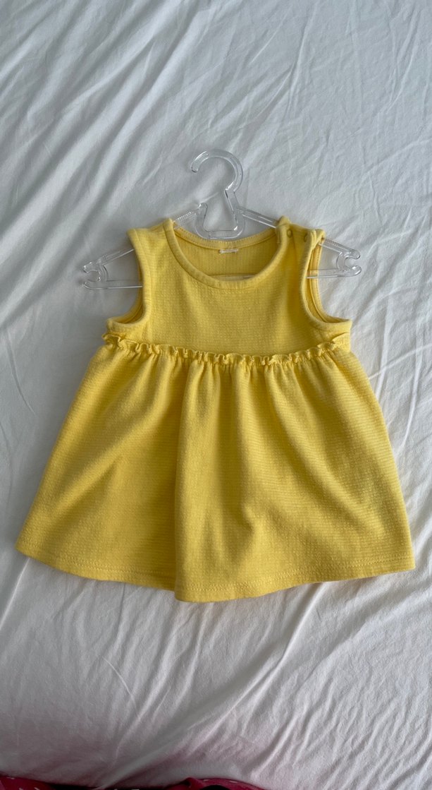 Sarı kolsuz kız elbisesi, keten kumaştan, bol kesim ve fırfır detaylıdır. Yuvarlak yaka ve sade tasarıma sahiptir.