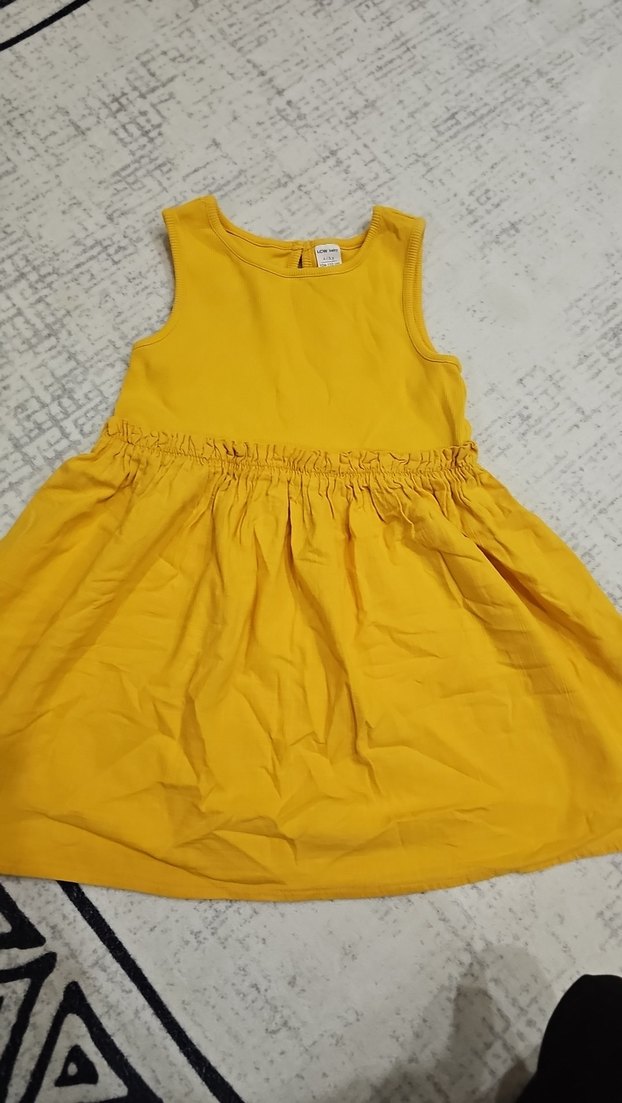 Yumuşak keten kumaştan, kolsuz, bol kesim ve belinde fırfır detaylı sarı kız elbisesi. Sade ve renkli tasarım.