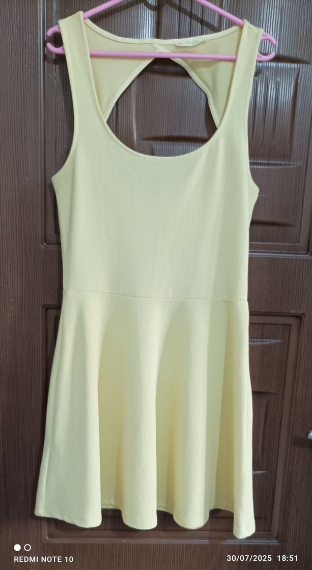 Kolsuz, sarı midi elbise, beli oturan ve hafif pileli detaylı, yumuşak sentetik kumaştan üretilmiştir. Günlük sokak stili için uygundur.orjinal Bershka marka boyu 87 beli 35 cm L bedendir hiç giyilmedi bir defosu yoktur