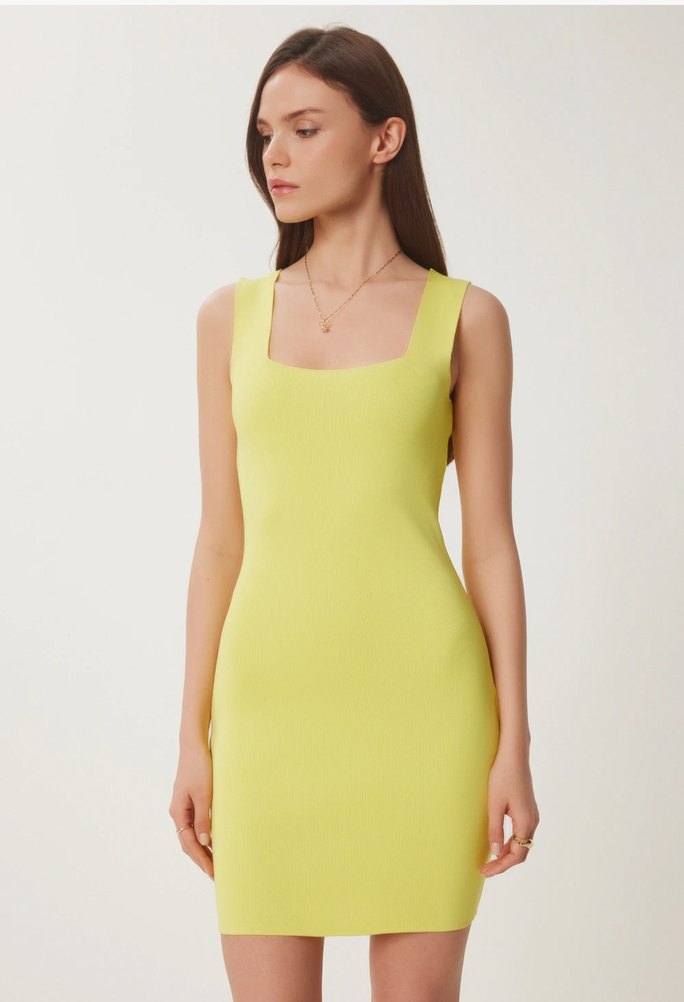 Sarı kolsuz triko elbise, ince oturan kesim ve kare yaka ile. Yumuşak sentetik kumaştan, romantik akşamlar için minimalist ve çağdaş tarzda.