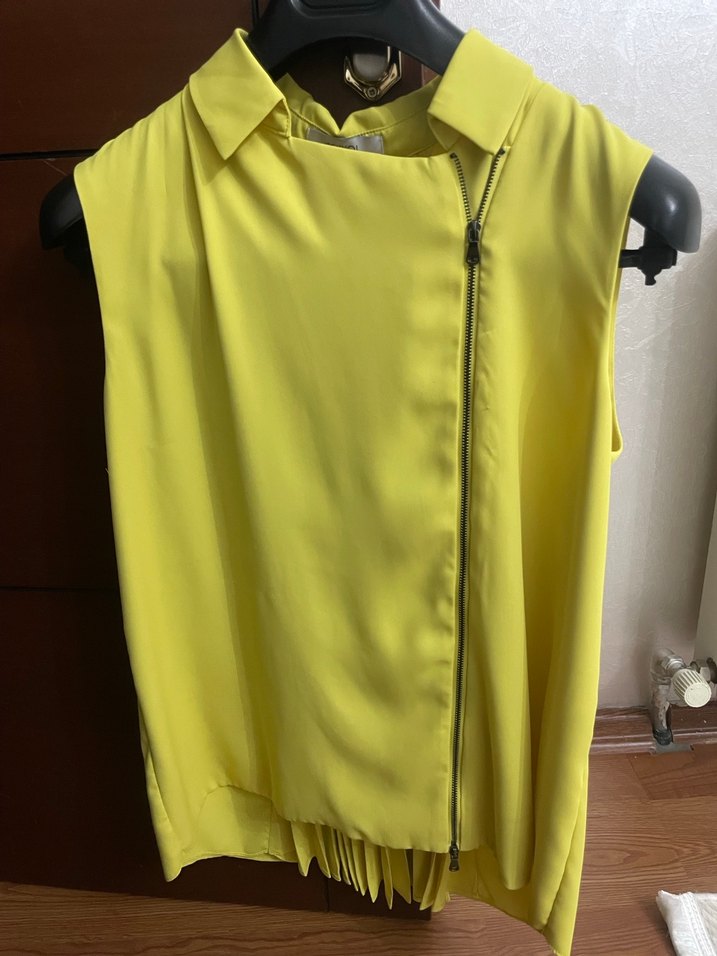 Sarı, kolsuz, yakalı ve ön fermuarlı bluz. Parlak sentetik kumaştan, regular fit ve mini boyda, sokak stili ve günlük kullanıma uygun.